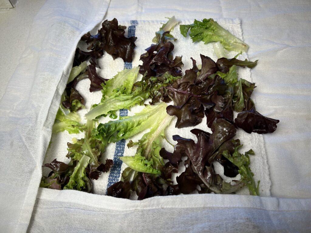 - If prepping ahead, remove the lettuce from the kitchen towel, place a damp paper towel in the bottom of a plastic bag, add the greens, and seal the bag. Refrigerate until needed.