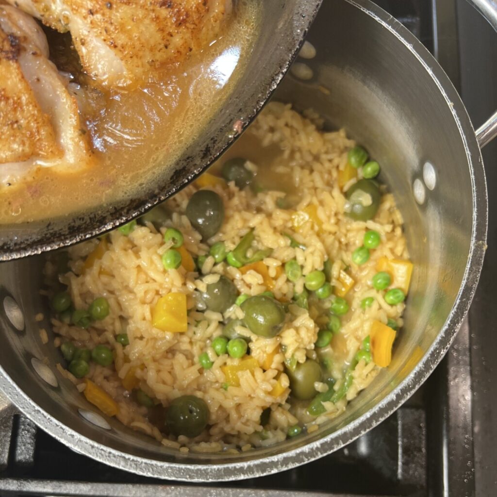 Italian risotto is a classic rice dish that uses long, slow, open-pan cooking with the liquid elements stirred into the rice in stages. It features arborio rice, a high-starch content variety that, when cooked as described, yields chewy rice grains surrounded by a thick, creamy-textured sauce. For best results, purchase a brand grown and packaged in Italy. https://amzn.to/427Gx7f Restaurant chefs working within a 15-minute turnout time limit have developed an ingenious way to serve risottos at their perfect texture by par-cooking the rice and then finishing it to order at service time. Being somewhat of a culinary purist, I’m not usually a fan of hybrid cuisines. But I tried combining authentic Arroz con Pollo ingredients with arborio rice and the risotto cooking method—and I think the result is a winner!