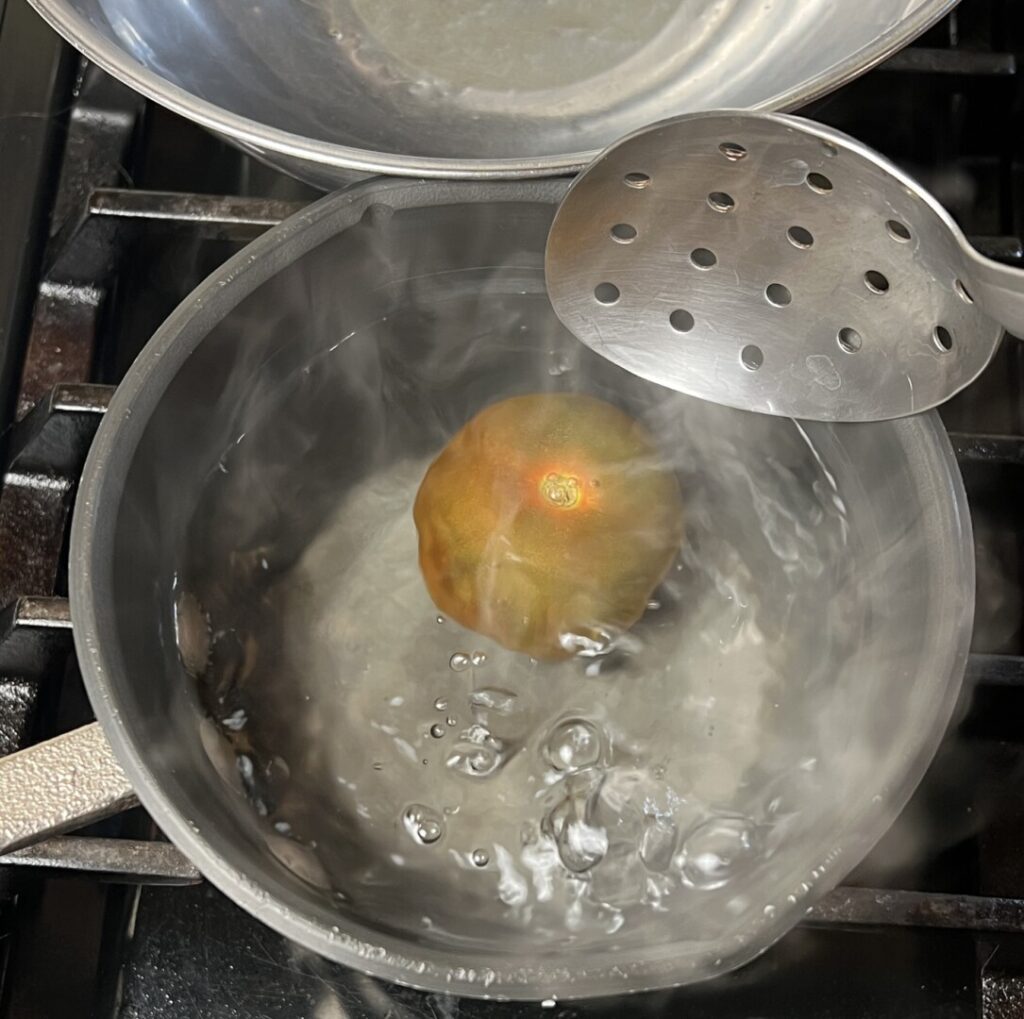 - Blanch, refresh, and peel the tomato(es) by dropping into boiling water for about 10 seconds, then transferring to ice-cold water and chilling for 5 minutes. Core and peel the tomato(es), cut in half widthwise, remove most of the seeds, and cut into ¾-inch chunks.