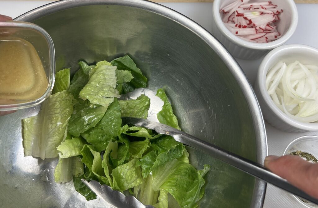 - Thoroughly shake the dressing to re-emulsify it, then drizzle onto the greens, using just enough to coat each leaf but not overdress. Toss with tongs until each leaf is lightly coated. As you toss, squeeze in the remaining lime juice and sprinkle in the step 11 oregano.