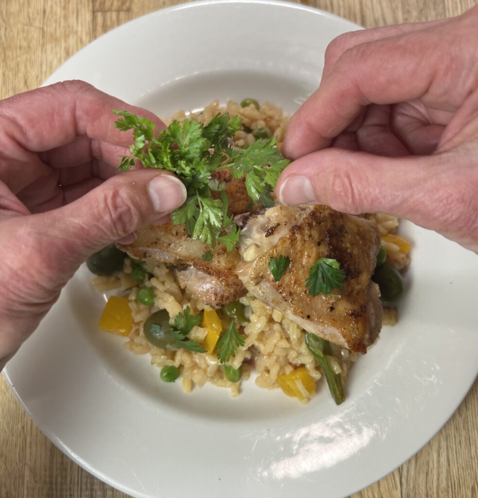 Now you’re ready to plate! Double check for all’onda consistency, then mound the risotto on warmed plates. Top each serving with two chicken thighs. Pull the cilantro into little pluches, or leaflets, and scatter overtop.