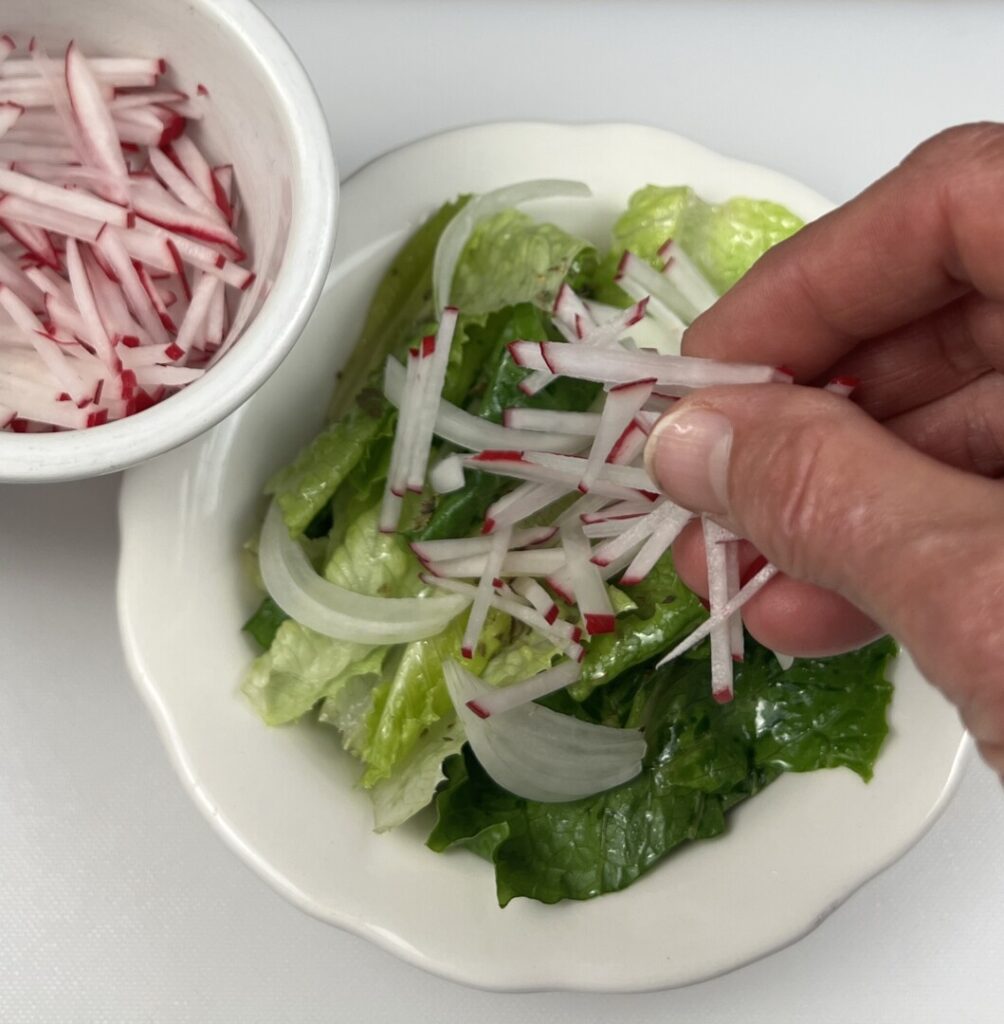 Rather than cut radishes into the usual rounds, let’s julienne them for a novel appearance. Together with julienne sweet onion, they make an attractive salad garnish.