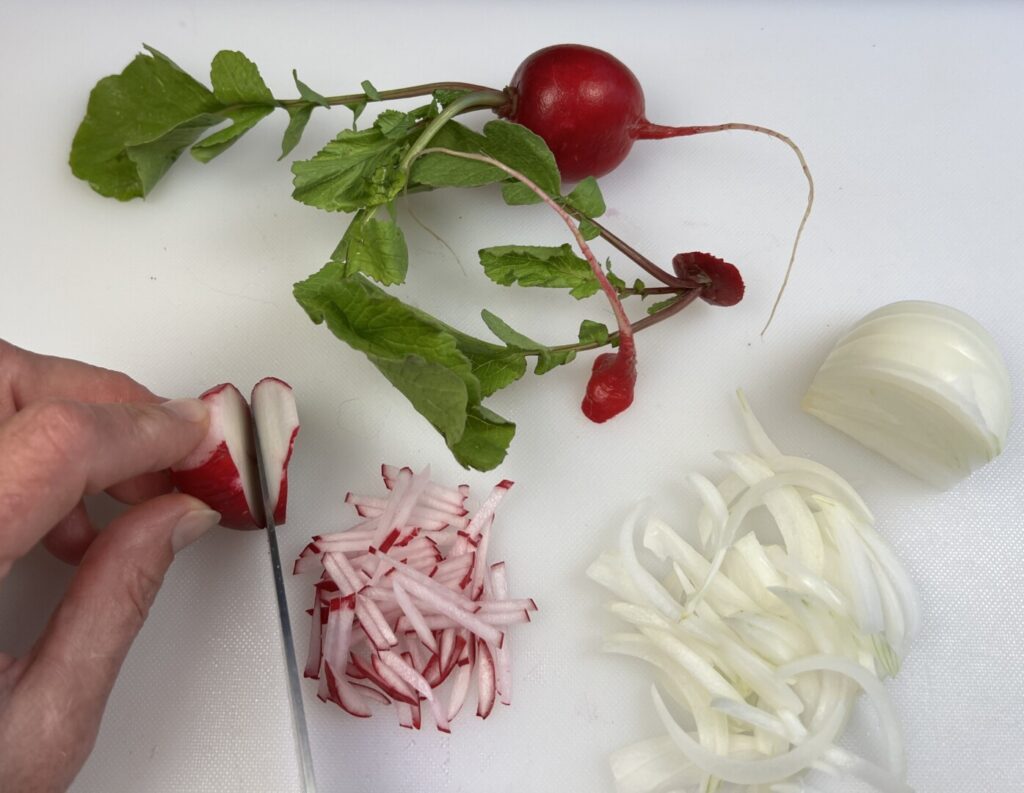 - Cut the radishes into fine julienne.