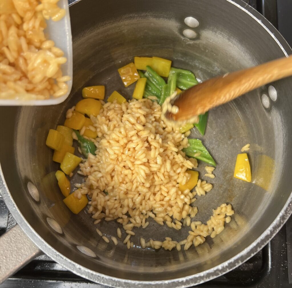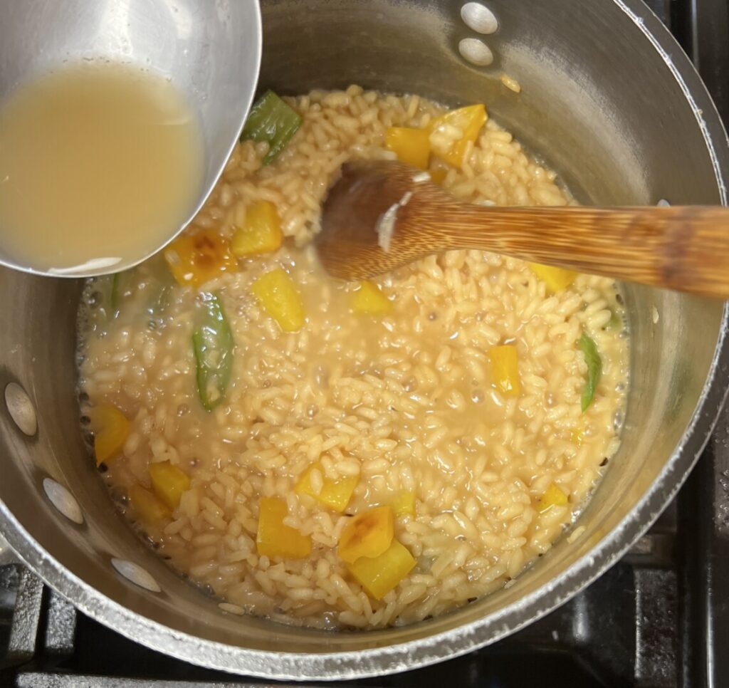 Finishing the risotto follows nearly the same method you used during prep. You’ll sauté the add-in peppers, then proceed by adding the par-cooked risotto and successive ladlesful of hot broth. Since the risotto’s cold from holding in the refrigerator, your first addition of hot broth will take a little longer to absorb.