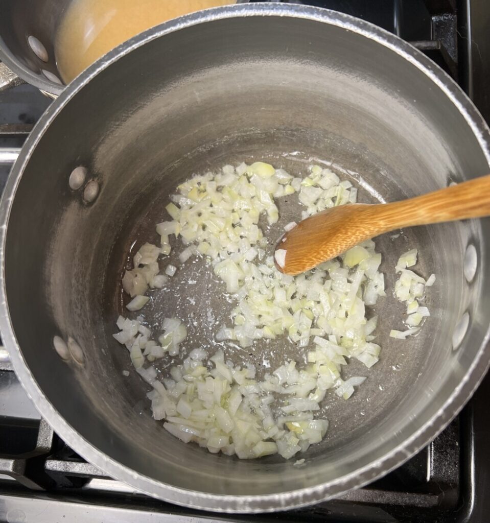 - Place the step 3 oil and butter in a heavy saucepan over medium heat until the butter melts. Stir in the onion and sauté for about 1 minute until softened but not browned. Add the garlic, then add the rice. Sauté the rice for about 1 minute longer until the grains are coated with fat and most have changed from translucent to an opaque white color. Don’t let the rice brown.