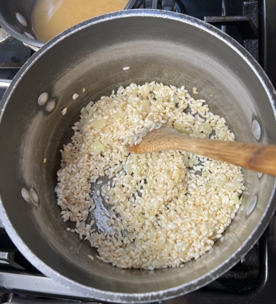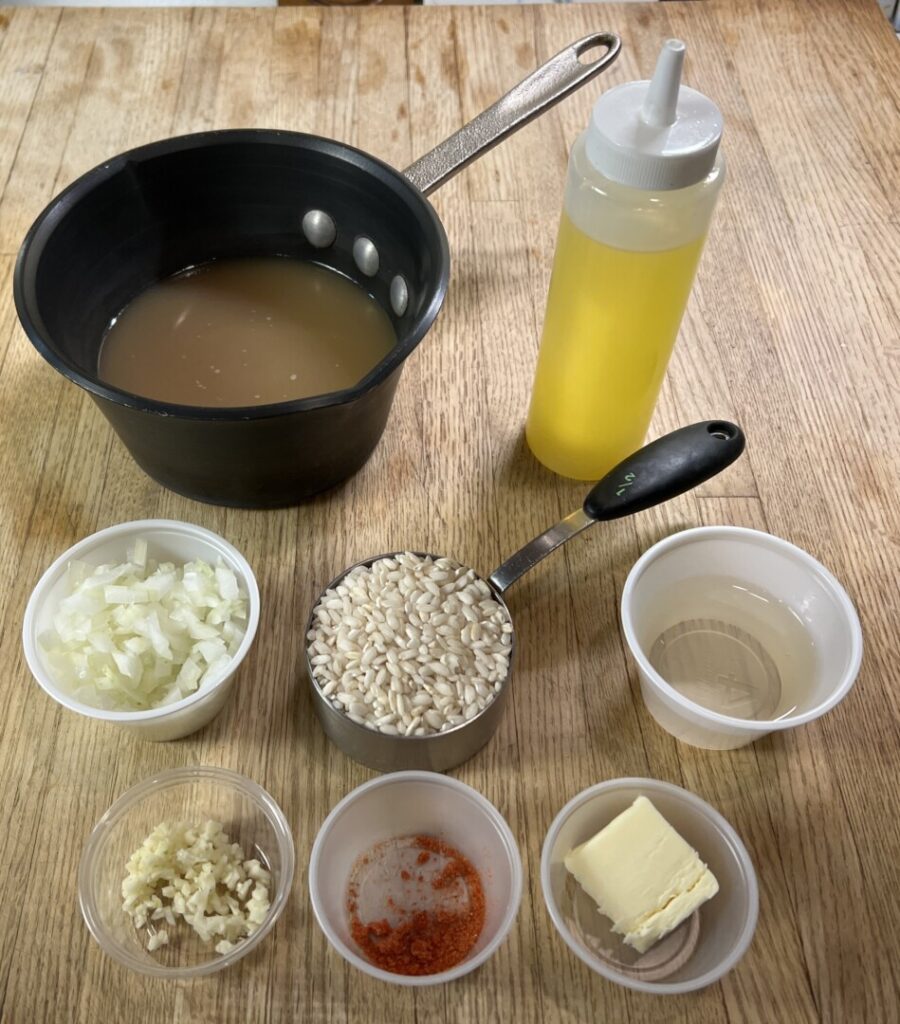 Now you’re ready to par-cook the risotto. Here’s the mise-en-place at your stove.