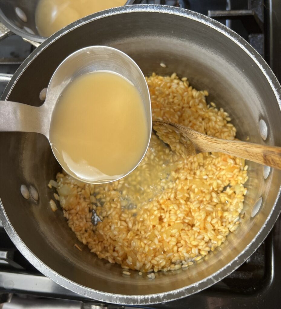 - Stir in an approximately 4-oz ladleful of hot stock, and continue stirring until the stock absorbs/evaporates, typically 2 to 3 minutes.