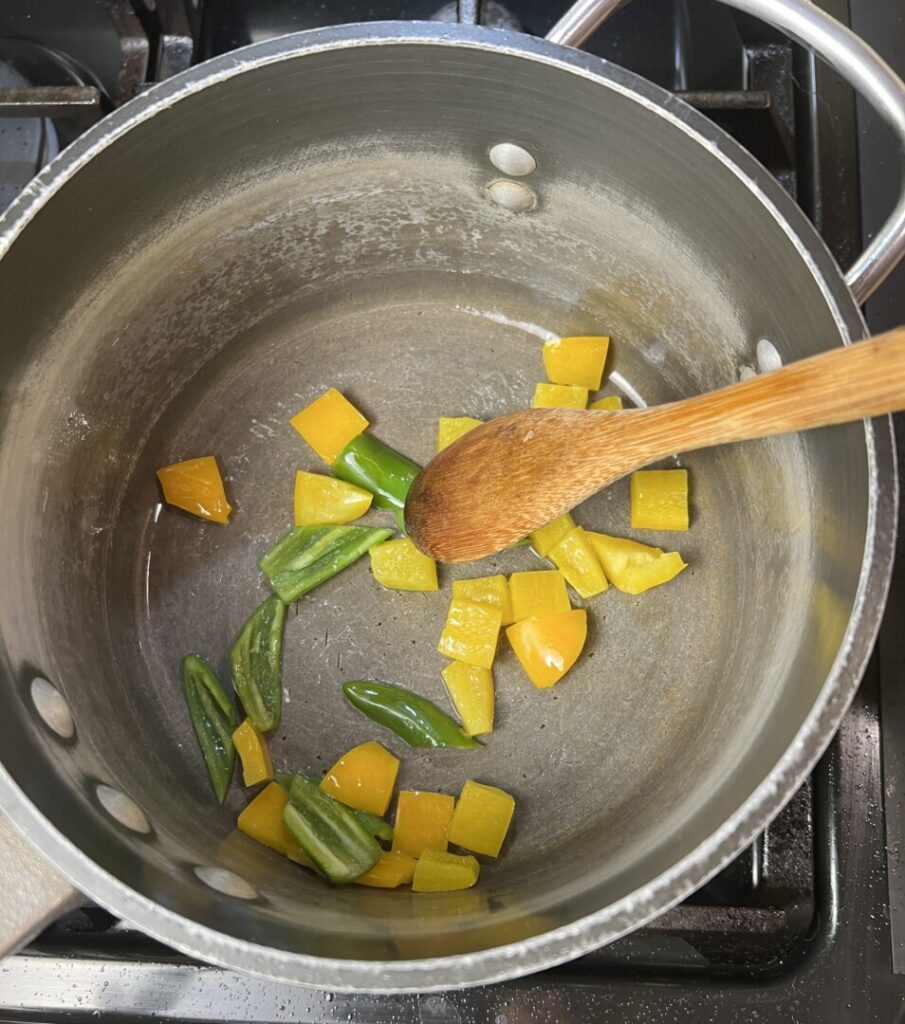 - Place a heavy saucepan over medium heat until hot. Add the step 9 oil, and then add the bell pepper and optional serrano chile. Sauté about 30 seconds.