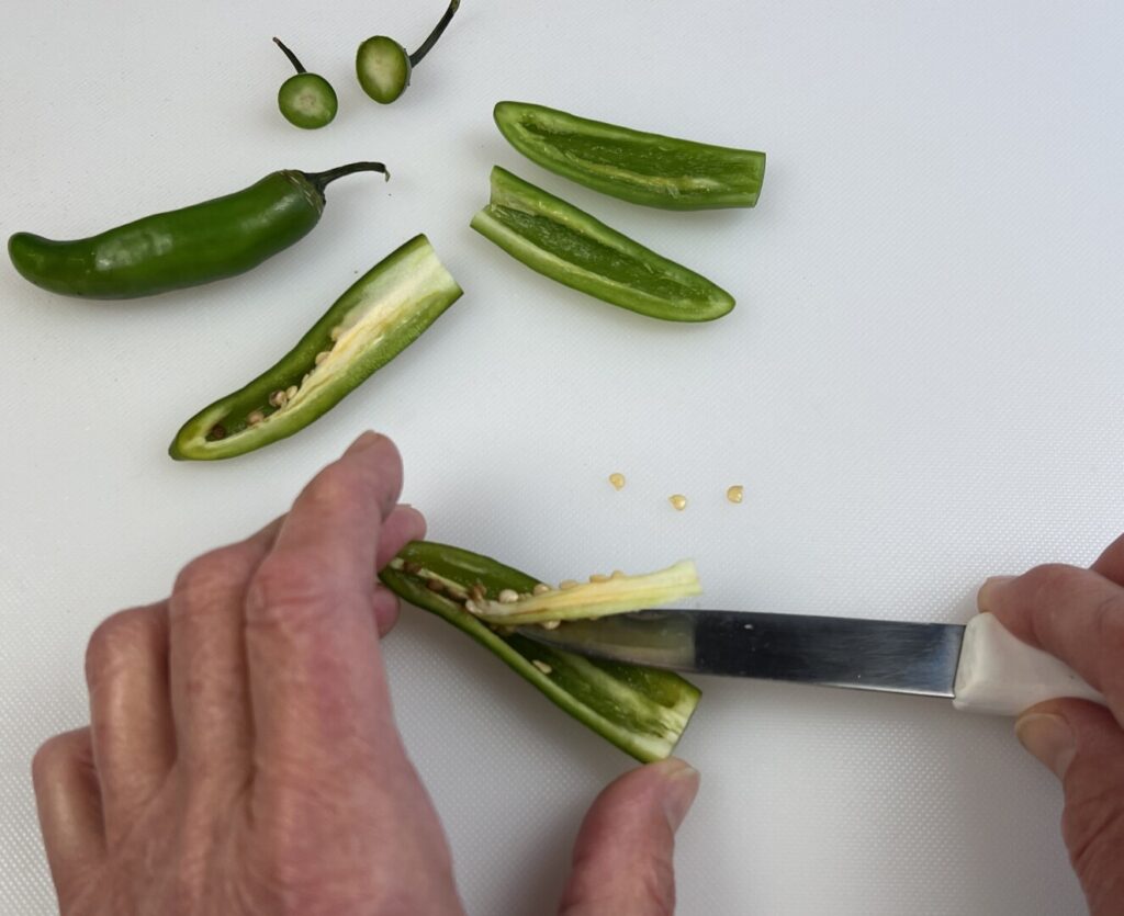 - Remove the stem from the optional serrano chiles, halve lengthwise, and remove the seeds. Cut each piece in half on the diagonal.
