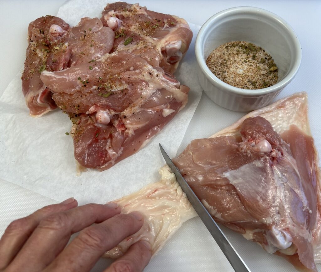 1. Trim and season the chicken thighs: