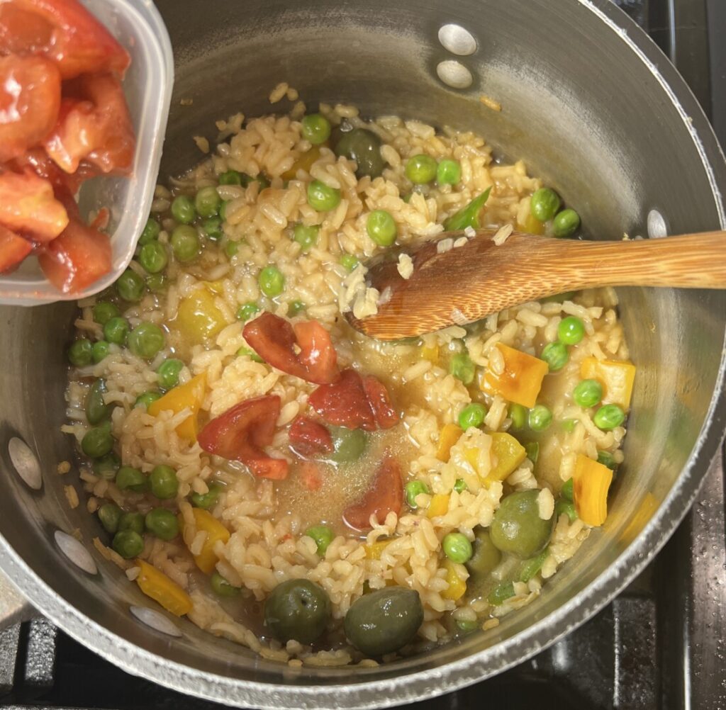 Add-in vegetables lend both color and Latin flavor to your risotto. Blanched, refreshed, peeled, and seeded tomatoes are fabricated into large chunks (and added at the end of cooking) so as not to melt into the hot rice.