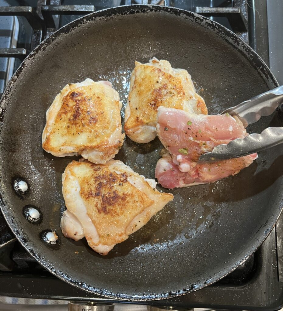 - Add the step 8 oil to the pan. Add the thighs, skin-side-down, and sauté without disturbing them for about 2 minutes until the bottoms are golden brown and the skin releases from the pan.