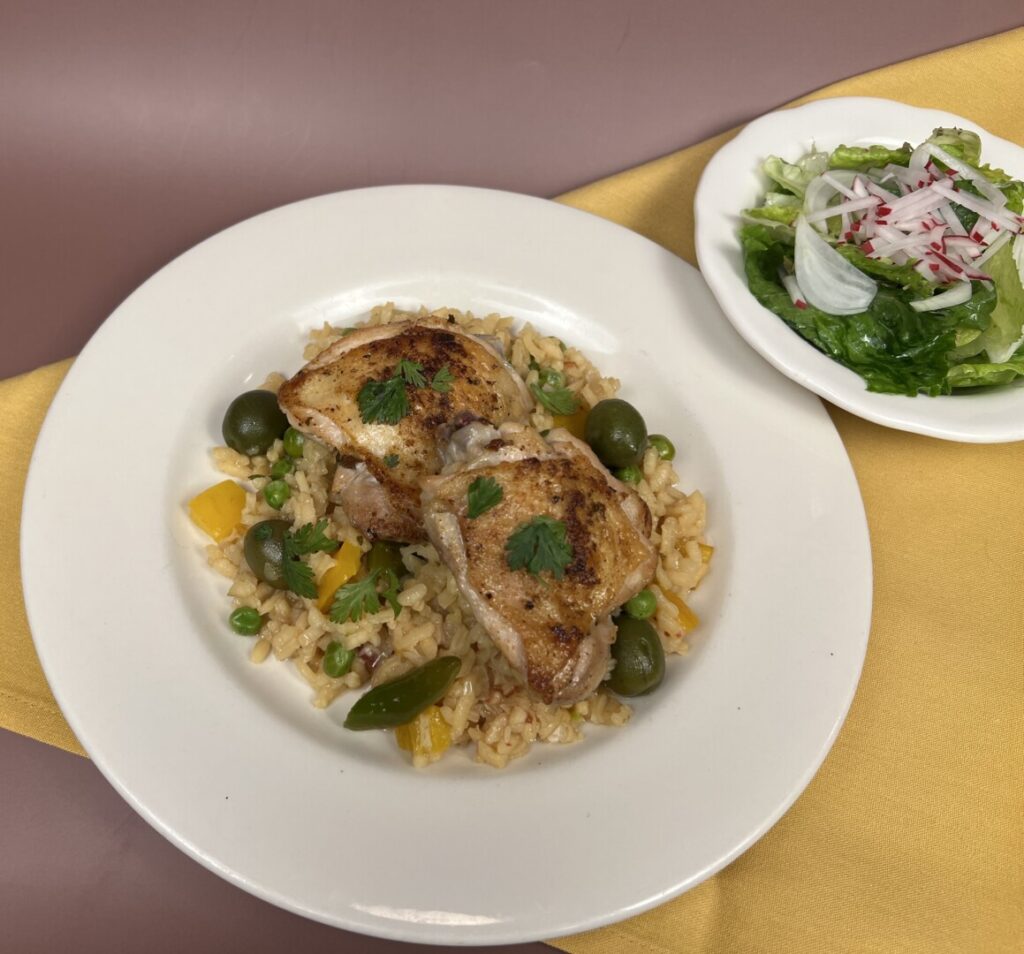 The classic Latin American dish Arroz con Pollo, or “rice with chicken,” is one of my favorite entrées—savory chicken cooked with fluffy, pilaf-style rice. So, naturally, I wanted to share my recipe with the PrepHoldCook community. But the long-grain rice customarily used for authentic Arroz con Pollo just doesn’t lend itself to prepping ahead. In my opinion, to achieve the correct texture it really has to be cooked from start to finish, and eaten immediately at the point of perfection. So how to present the lively Latin flavors of this iconic dish in our PrepHoldCook format? Add them to a rice dish that’s prep-ahead friendly!