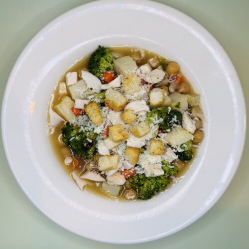 Use planned leftovers from the Dijon Chicken with Autumn Vegetables recipe to create a tasty and healthful Italian-style soup.