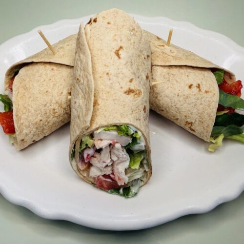 - Roll up each wrap sandwich and secure shut with a toothpick.