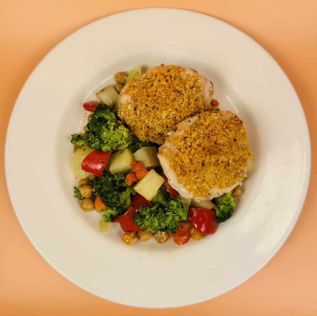 - Place 2 crumb-topped chicken breasts on top of the vegetables on each plate.