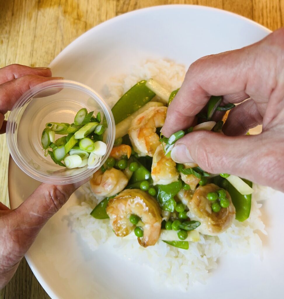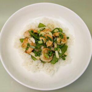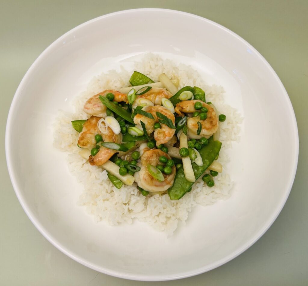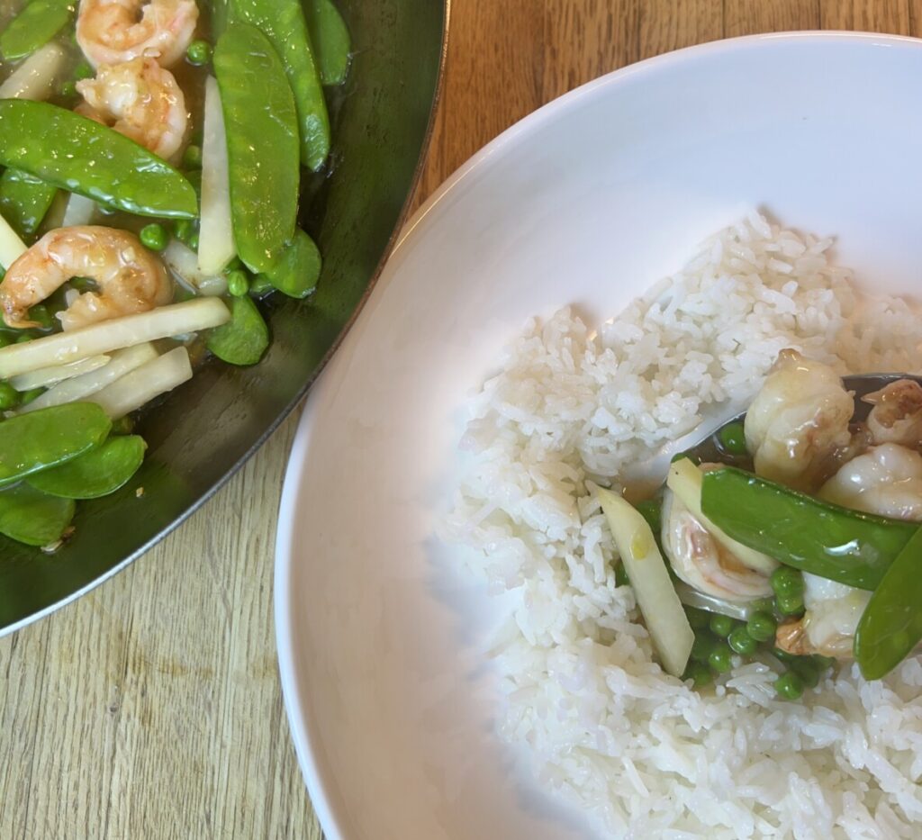 Ginger Shrimp and Jade Vegetables Stir-Fry Over Jasmine Rice