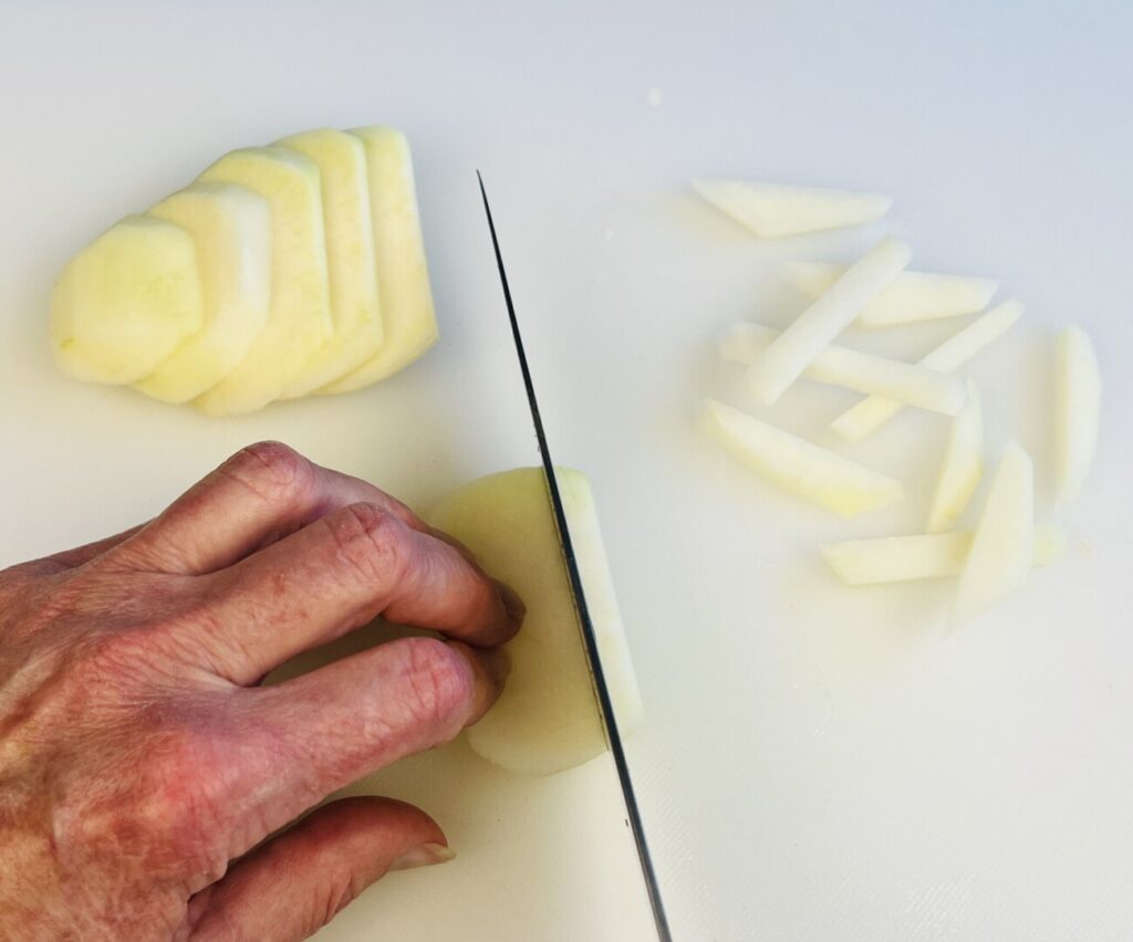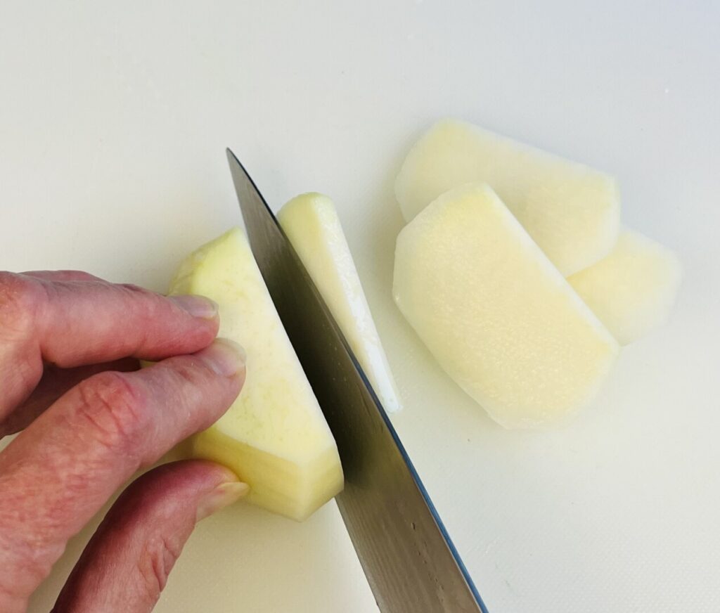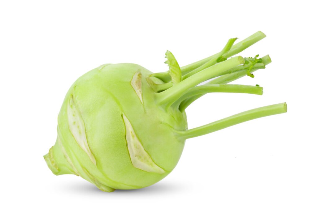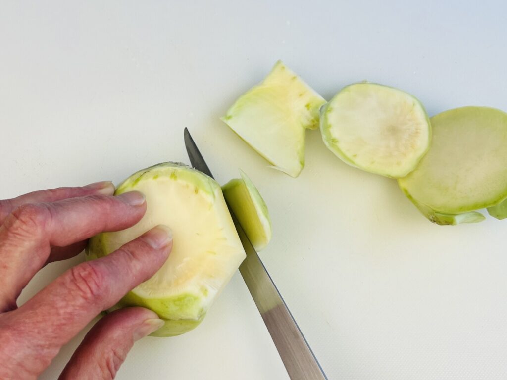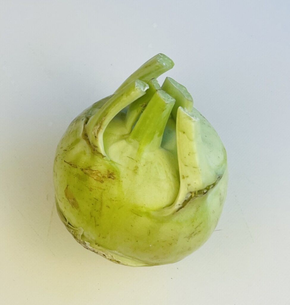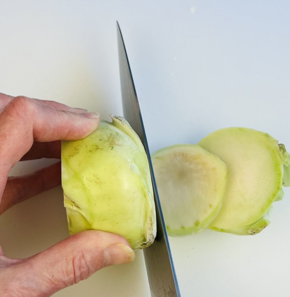 - Trim off both ends of the kohlrabi and peel off the thick skins. Cut the kohlrabi into slender batonnets (small French-fry shapes about 3/16 x 3/16 x 2-inches in length).