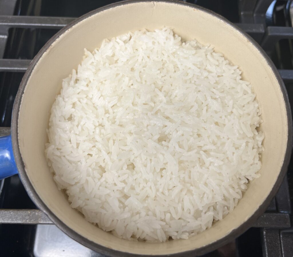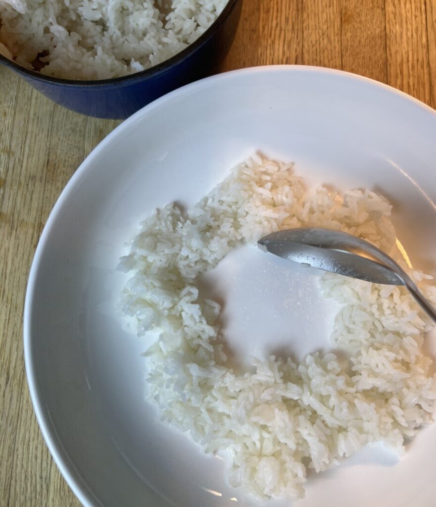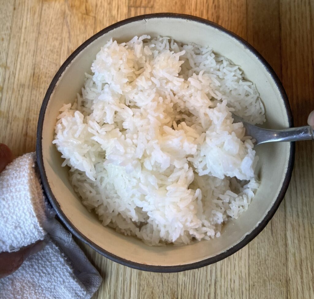 All types of rice cook by absorbing liquid, which causes the rice grains to soften and swell. Most types of rice can be cooked directly in boiling water start-to-finish. However, white jasmine rice (like basmati) has a soft texture that gets mushy when cooked that way. After the dust-like particles that result from milling have been rinsed away, jasmine rice is then soaked in hot tap water for 20 to 30 minutes so that it absorbs some water slowly and the grains swell gradually. Then it’s drained and cooked with water measured in a ratio of 1:1 to the original amount of raw rice. For best texture, start cooking, covered, on a stove burner until the water is absorbed and then finish it in the oven. In traditional Chinese cooking rice is cooked unseasoned; I use a touch of salt for savor and a bit of oil to make the grains glisten.