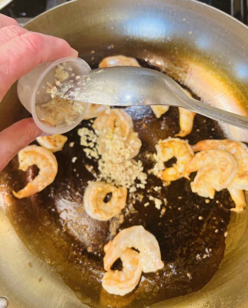 - Return the wok to the heat until very hot. Stir the shrimp to evenly coat with the marinade. Add about 1 Tbsp oil to the pan and then add the shrimp. Stir-fry about 30 seconds until they turn coral-pink and begin to curl. Add the ginger and garlic and stir-fry about 15 seconds longer.