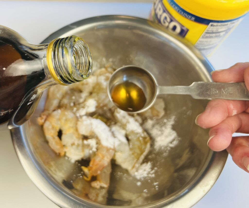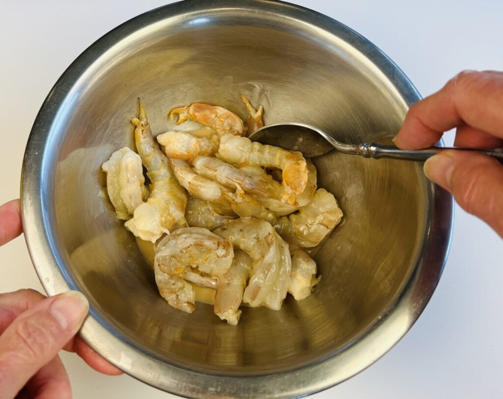 The next step is to “marinate” the shrimp. However, both the ingredients used in a Chinese cuisine marinade and its purpose are different from marinades used in Western cuisines—hence the quotation marks. A basic Chinese marinade comprises rice wine, cornstarch, and salt or soy sauce. The preferred rice wine is a type called shao xing, of which there are many Chinese brands available. https://amzn.to/3YgCS4e Avoid shao xing labeled “cooking wine,” as this has had salt added to comply with some US state regulations. Unlike Western cuisine marinades, the purpose of a Chinese marinade is not flavor-enhancement and tenderization but, rather, to create a starchy, semi-fluid coating on the exterior of a protein food before stir-frying. This coating serves to prevent the food from sticking to the pan, hold in moisture, and enhance browning. The process is simple: Just add the marinade ingredients to the shrimp and stir to evenly coat them. Because Chinese rice wine is low in acidity and the sodium level is low, there’s no danger of over-marination.
