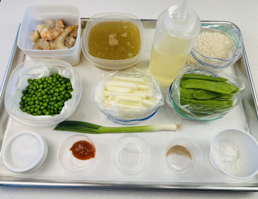 Only a few tasks remain, and then your mise-en-place is complete. Here’s your mise tray: (Don’t forget the ginger and garlic, like I did!)