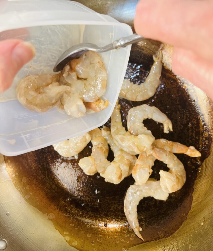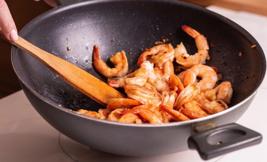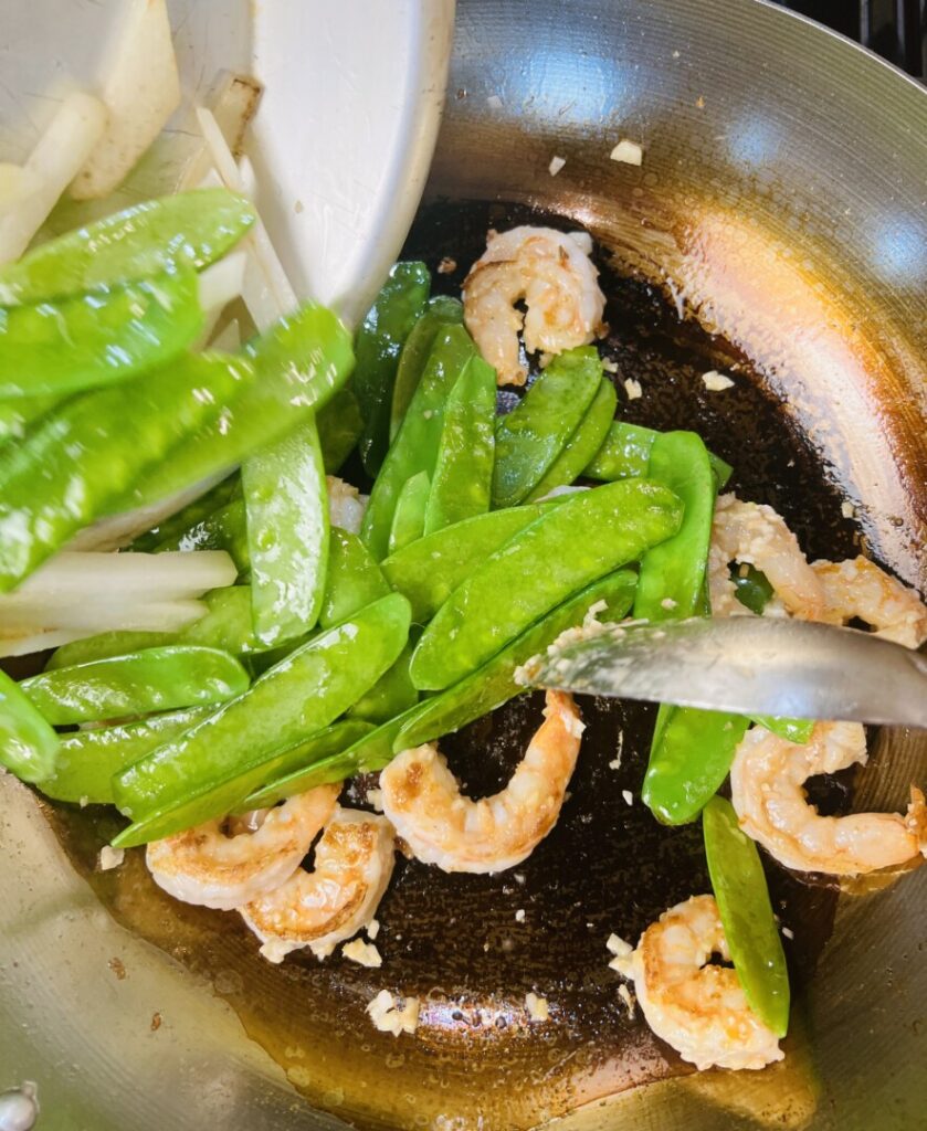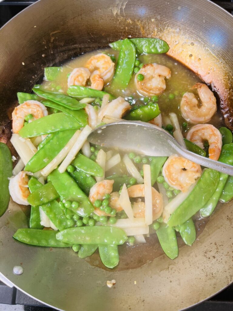 - Slide the par-cooked vegetables into the wok and toss to combine with the shrimp.