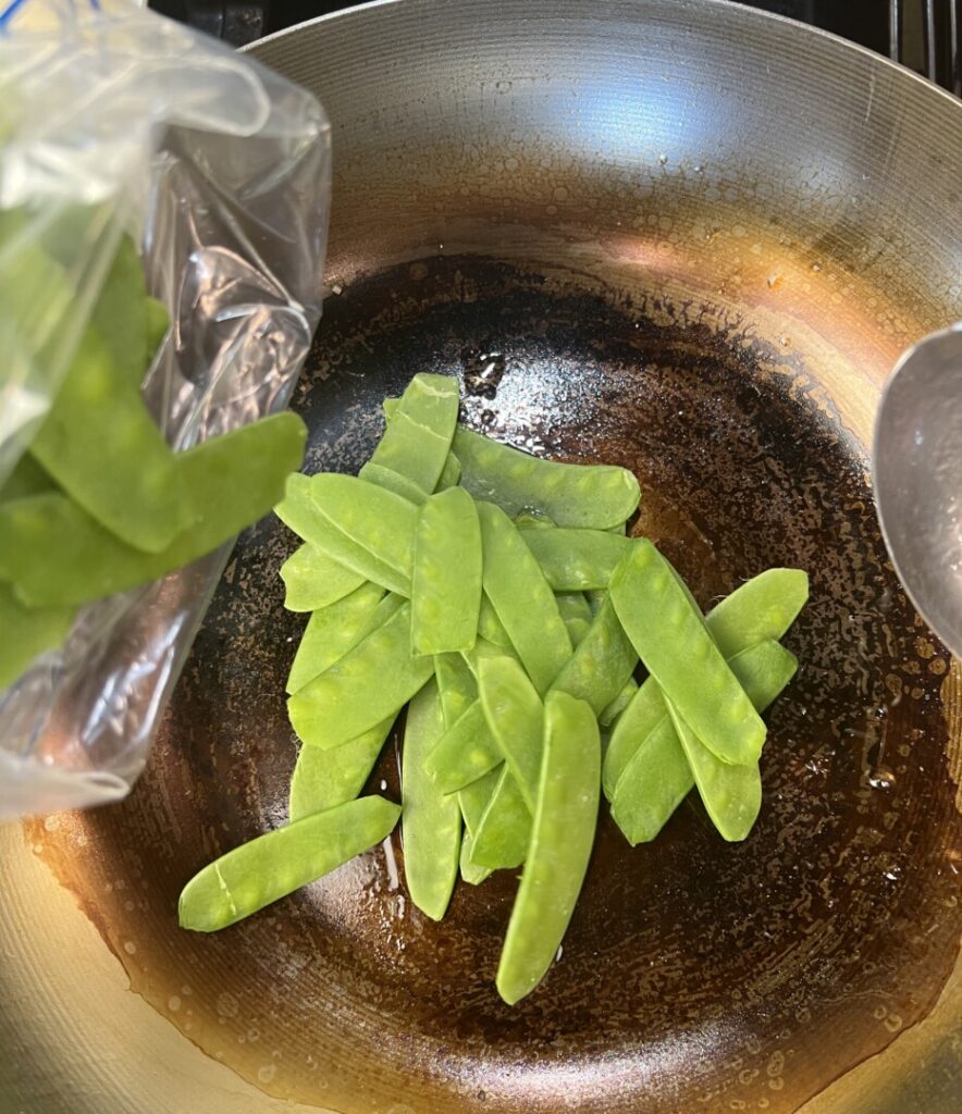- Return the wok to the heat until very hot. Add a film of oil, and then add the snow peas and a pinch of salt. Stir-fry about 20 seconds, and then add them to the work bowl.