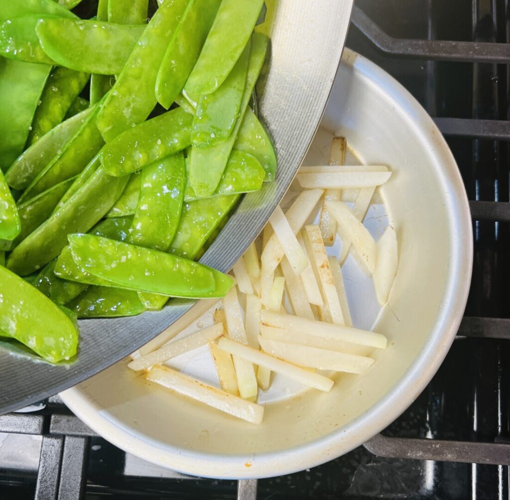 Fabricating the vegetables for our stir-fry is an important part of the prep. If you’re able to find fresh young peas in the pod, shell them. Just give each pod a gentle squeeze at the pointed tip; the pod will open enough to slide your fingers in and nudge out the peas.