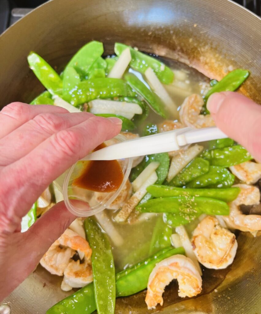 - Push the shrimp and vegetables to the side and wait for the sauce liquid to boil. Stir in enough of the slurry to thicken the sauce to a nappé texture (coats the back of a spoon yet flows on a plate).