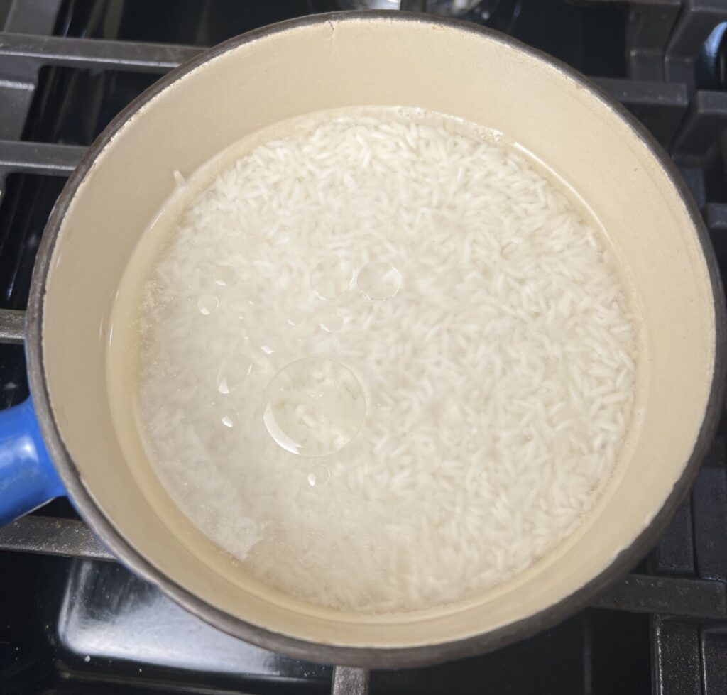 - Place the pan over high heat, cover it, and bring the rice and water to the boil. Monitor the pan by listening and watching for steam to emerge under the lid.