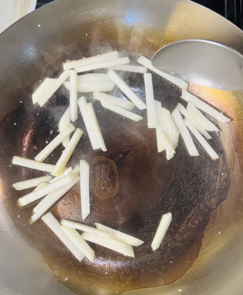 - Add more oil, then stir-fry the protein. (Add whole aromatics at the beginning, minced aromatics at the end.)