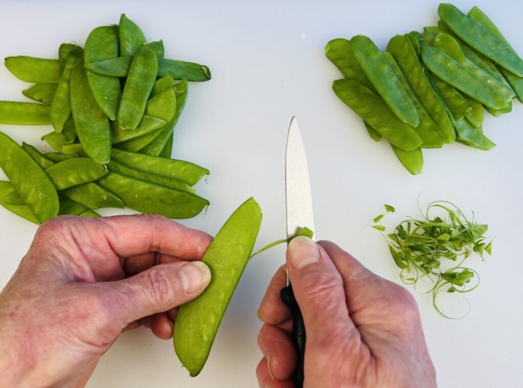 - Use a paring knife to string the snow peas: Cut off the stem end tip on the diagonal and pull to remove the string that typically runs along the side of the snow pea. Cut off the other tip and repeat, ensuring that the strings on both sides are removed.