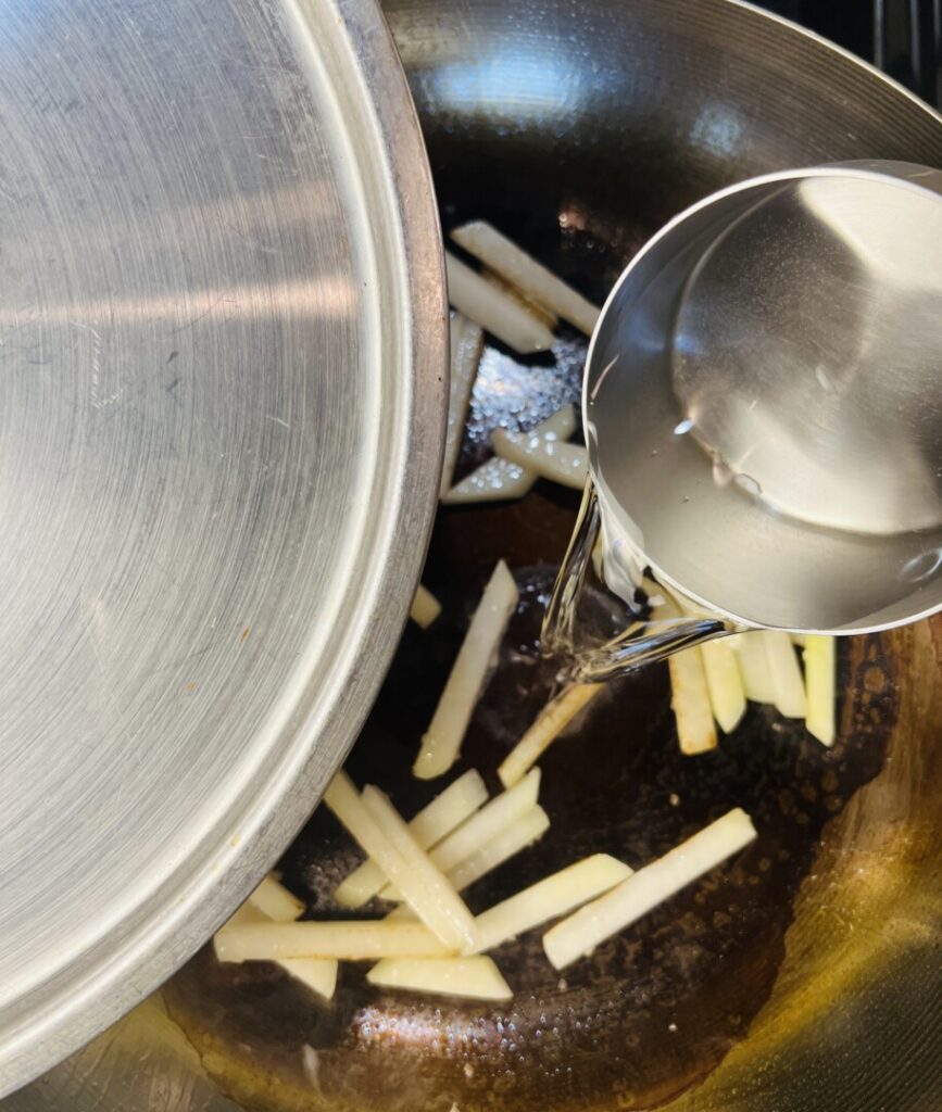 Authentic stir-frying requires the highest heat you can get out of your stove. Don’t be intimidated! You’ll soon get used to it and feel comfortable with it. The smoky char and deep umami flavor that can be achieved with a carbon steel pan and high heat is called wok hei, “the breath of the pan.” Put your pan on the burner and wait until you can see the shimmering of heat and some wisps of vapor rising from the pan’s surface. Only then add the oil and begin stir-frying. Always wait for the heat to recover between batches.