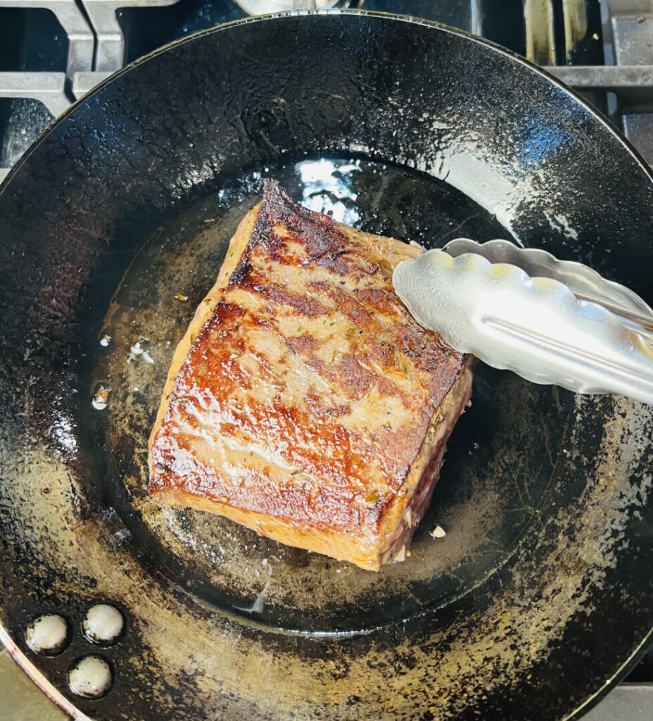 The first step in pan-roasting is to sear the exterior of the meat by sautéing it. For best results, I recommend using a well-seasoned carbon steel sauté pan, such as the Le Buyer pan I use. https://amzn.to/4j6z262 For instructions on how to season a pan, follow this link: https://prepholdcook.com/tutorials/how-to-season-a-carbon-steel-pan-with-chef-lou/
