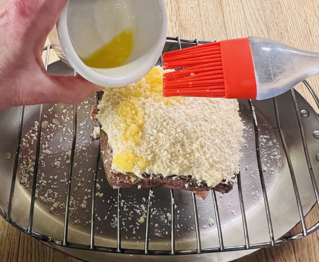- Place the cornstarch in a small strainer. Dust the top of the beef with cornstarch, spread the the topping onto it, and then press the panko on top. Use a basting brush to dab the melted butter onto the top of the beef without dislodging the topping.