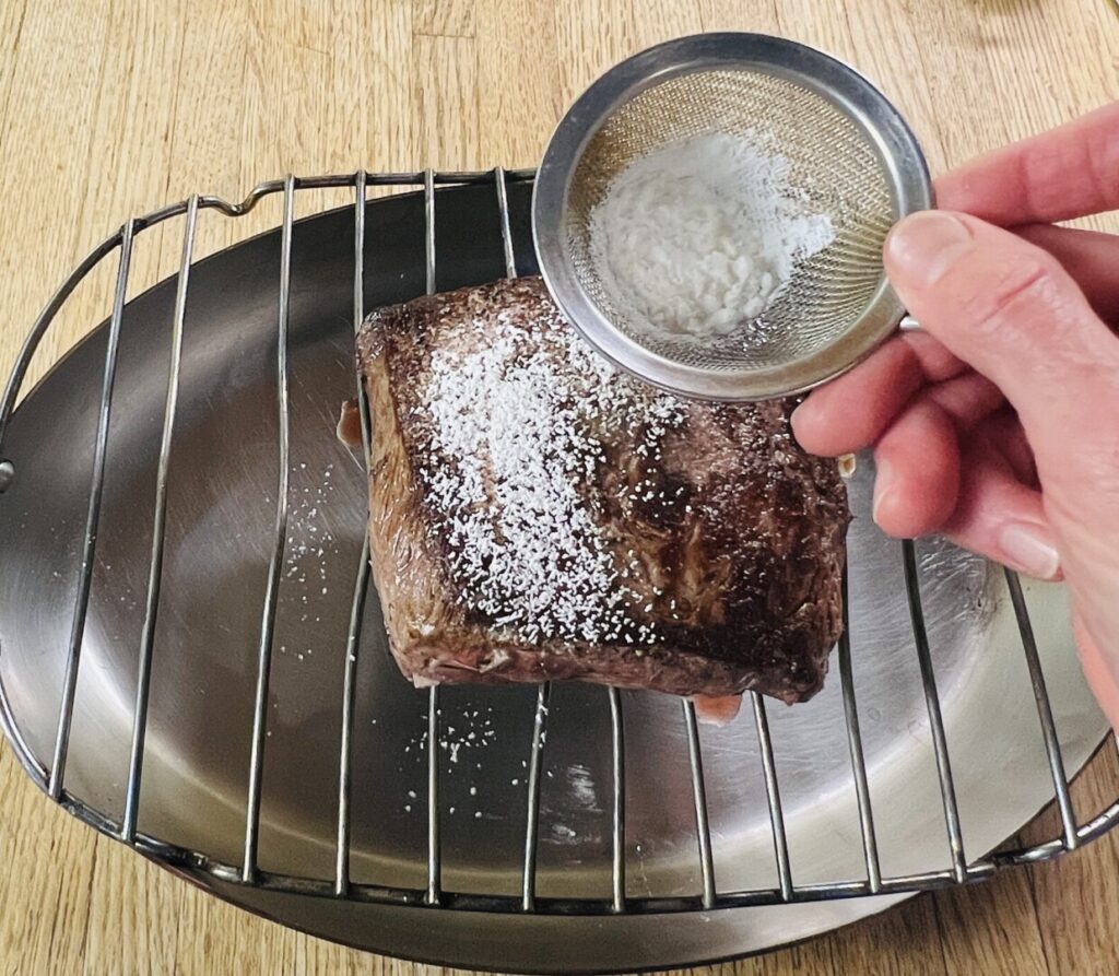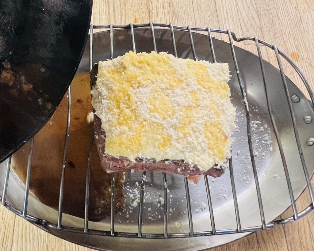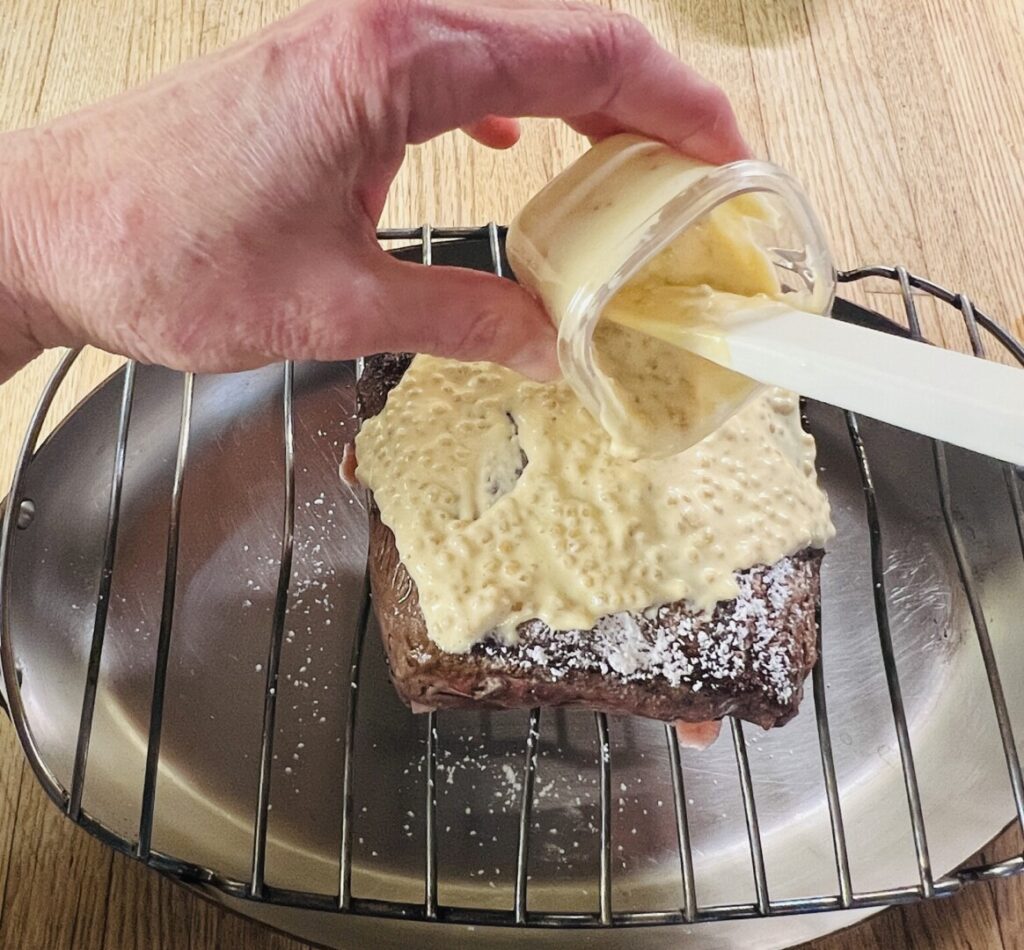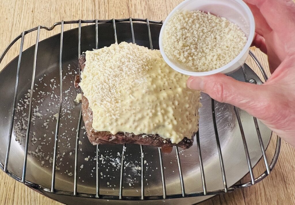 The secret to creating a great crusted steak or roast is to make sure the crust adheres well enough to stay put while carving. Dust the seared and cooled top surface with a flurry of cornstarch to provide some “glue.” Then spread the mustard topping evenly across the top. Coat with breadcrumbs, and pat gently to help them adhere. Drizzle the crumbs with melted butter to enhance browning. Finally, pour the fond into the pan and put your steak in the oven.