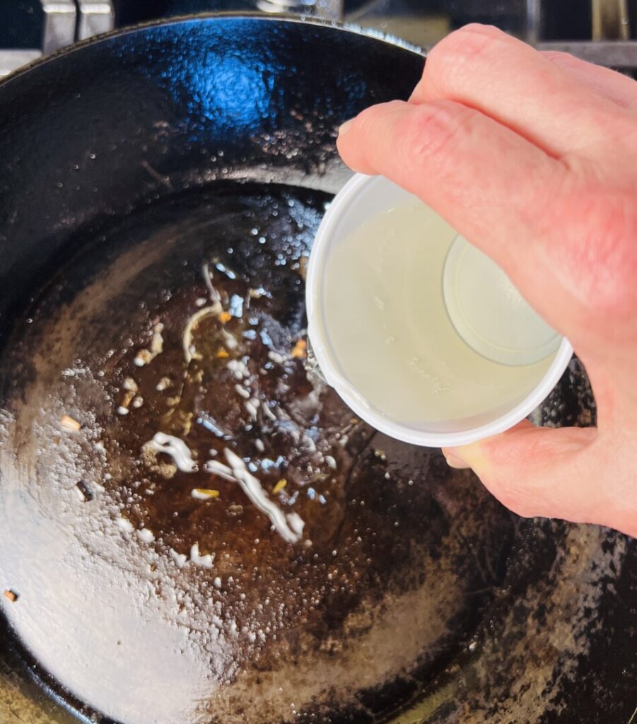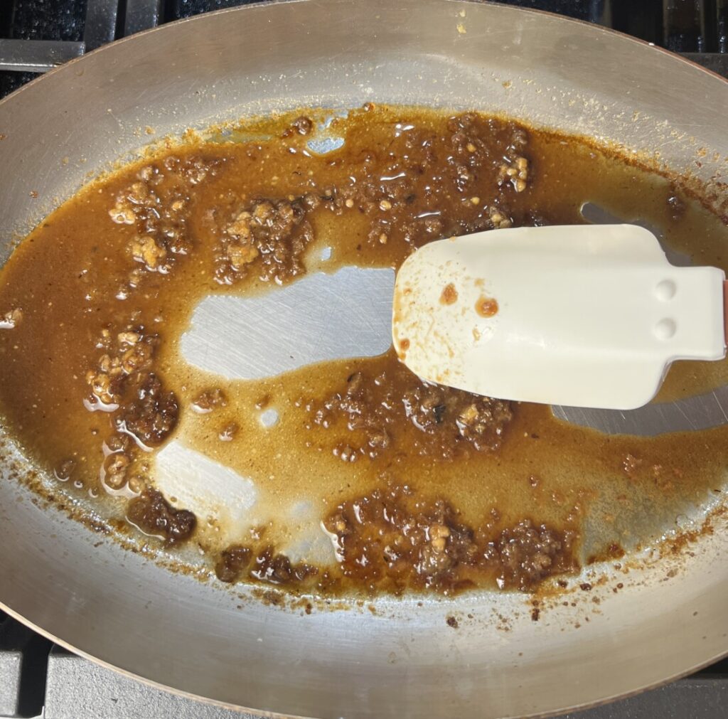 Proper searing results in some browned bits of protein, called sucs or pan glaze, in the bottom of the pan. We’ll release these flavorful particles by deglazing the pan with some wine and beef stock. The resulting fond will become the basis of our jus (French for “juice”), the liquid that results from roasting.