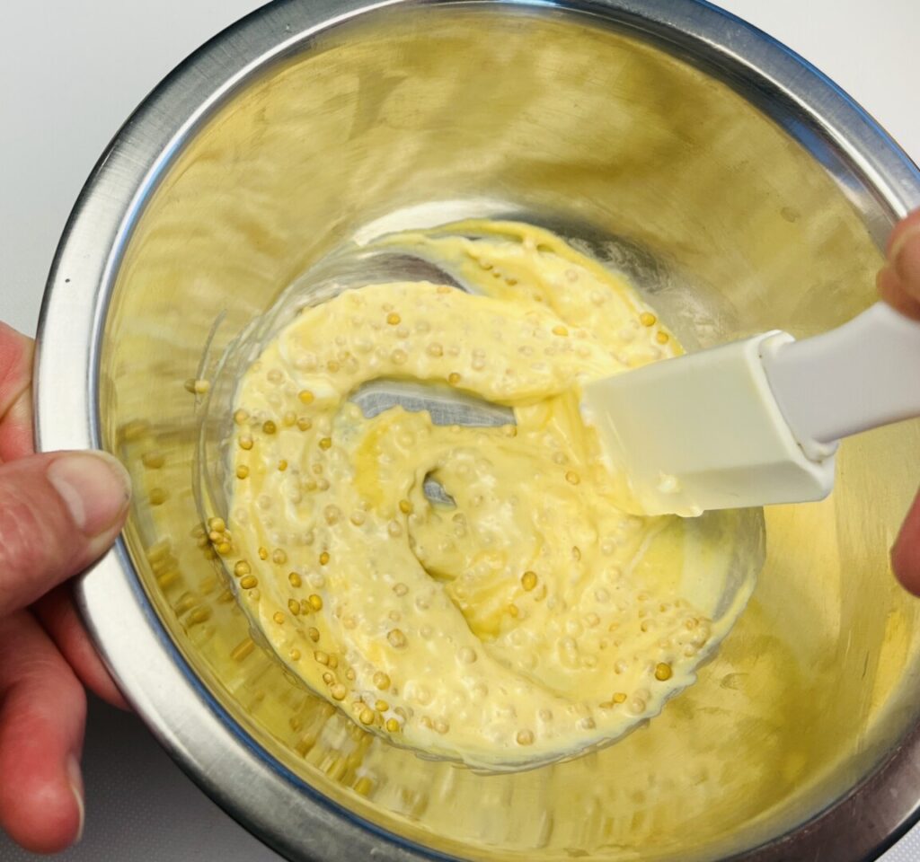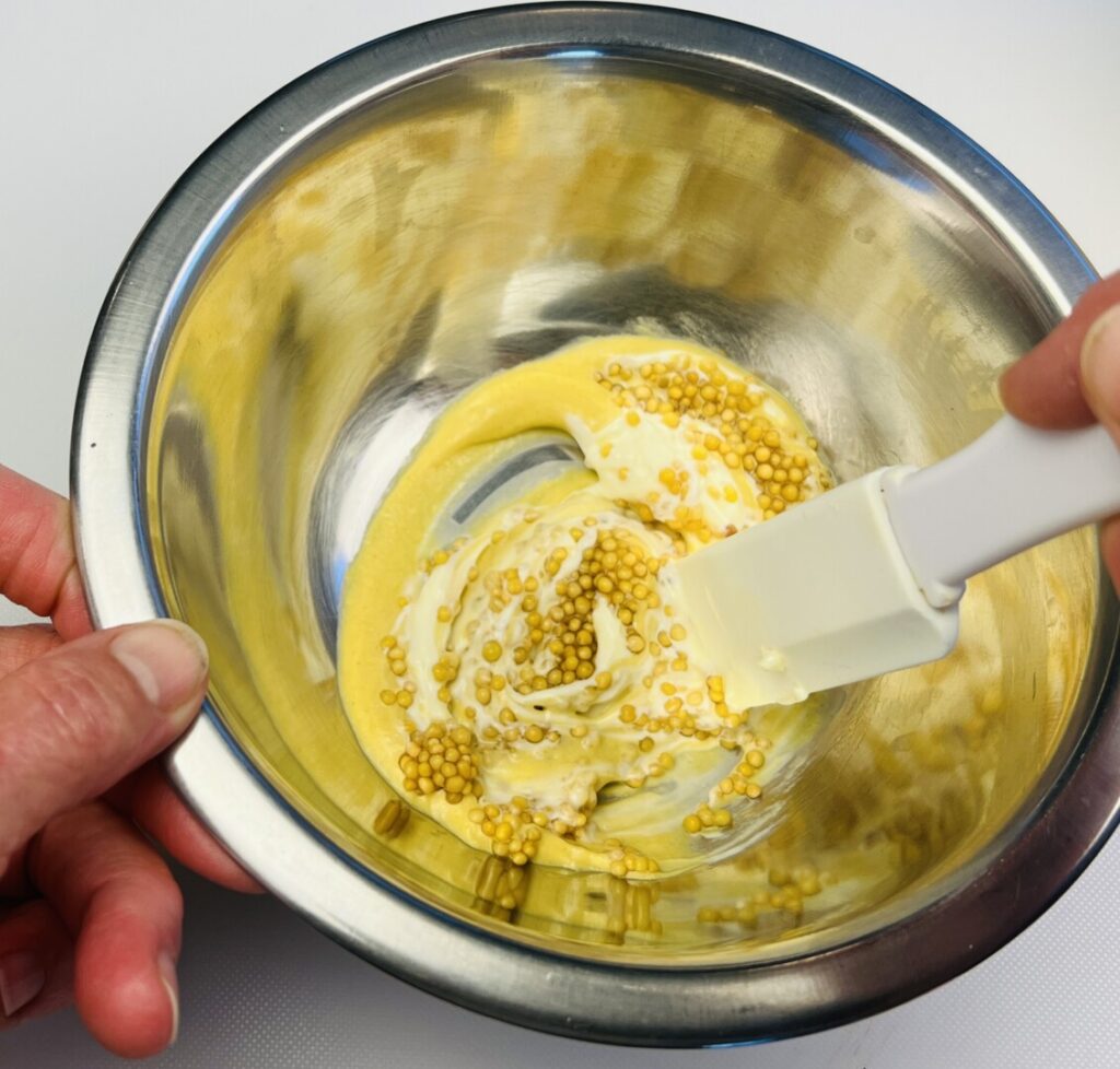 First, the mustard seeds are soaked in boiling water to soften and plump them. The photo on the left shows dry mustard seeds next to seeds that have soaked for half an hour. Smooth Dijon mustard provides tangy flavor and mayonnaise acts as a binding agent, helping the topping adhere to the meat. We’ll add the breadcrumbs just before roasting.