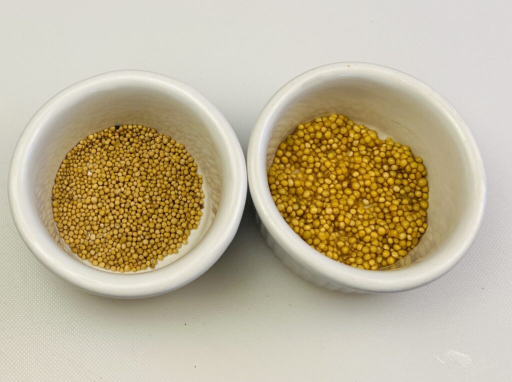 - Bring about a cup of water to the boil. Place the mustard seeds in a small bowl and then pour the boiling water over them. Soak for about 30 minutes and then drain off the water.