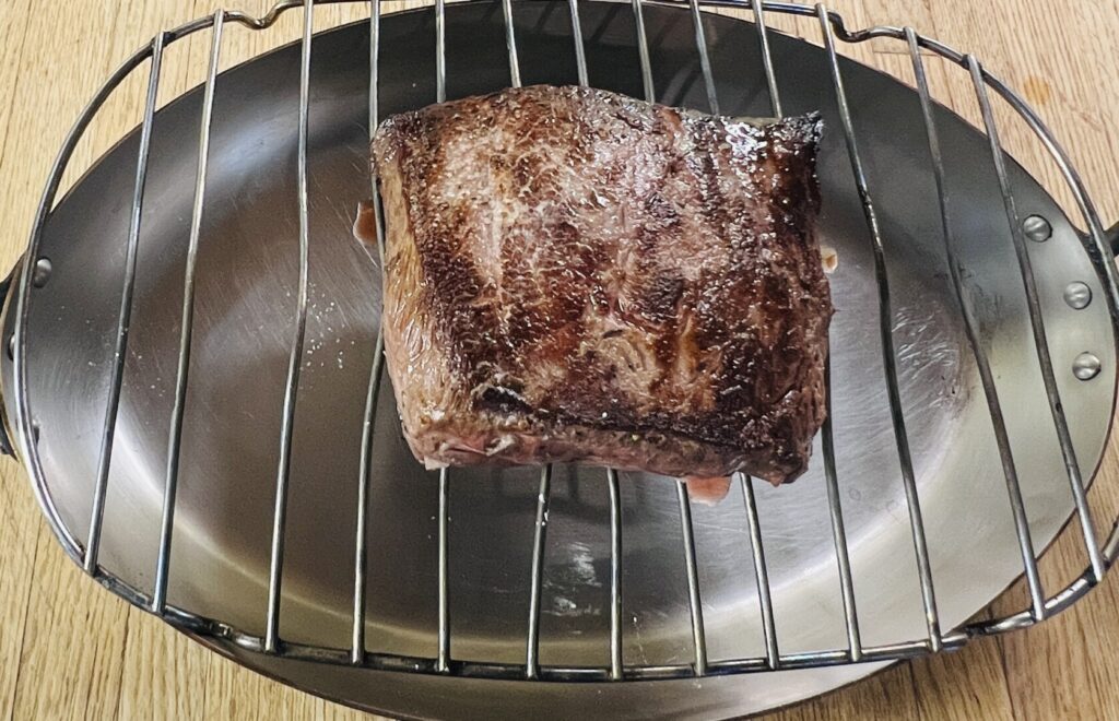 - Remove from the oven and rest on the back of the stove for at least 10 minutes so that carryover cooking raises the internal temperature to 130°F.