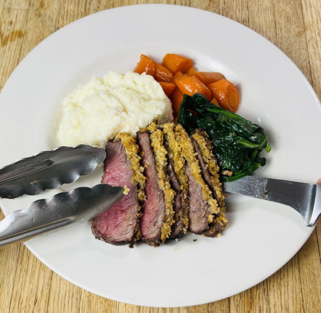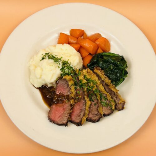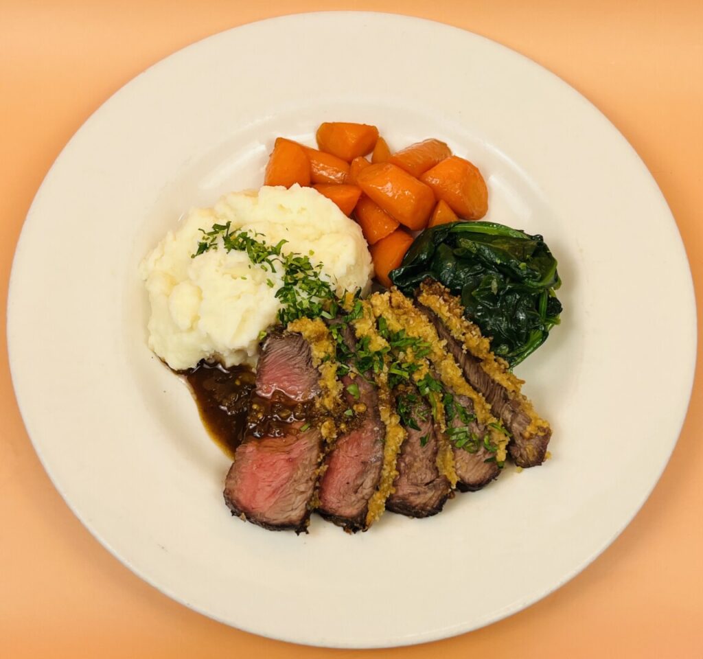 Mustard-Crusted Steak with Purée Potatoes, Maple-Glazed Young Carrots, and Wilted Baby Spinach