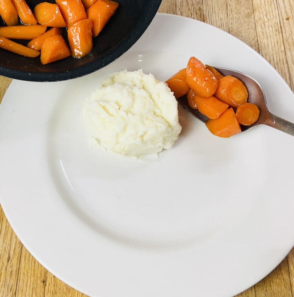 - Arrange a portion of carrots on the back of the plate next to the potatoes.
