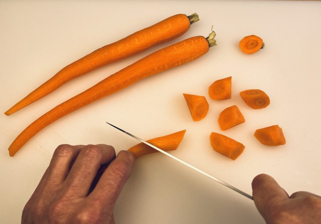 - Roll-cut each carrot: Starting at the thick end, make a sharp diagonal cut about ¾ inch from the end; Roll the carrot a quarter-turn away from you, and then make another diagonal cut. Continue to the pointed tip, making the pieces longer as they get thinner. (To view a video of this technique, use the link in the lesson section of the recipe post.)