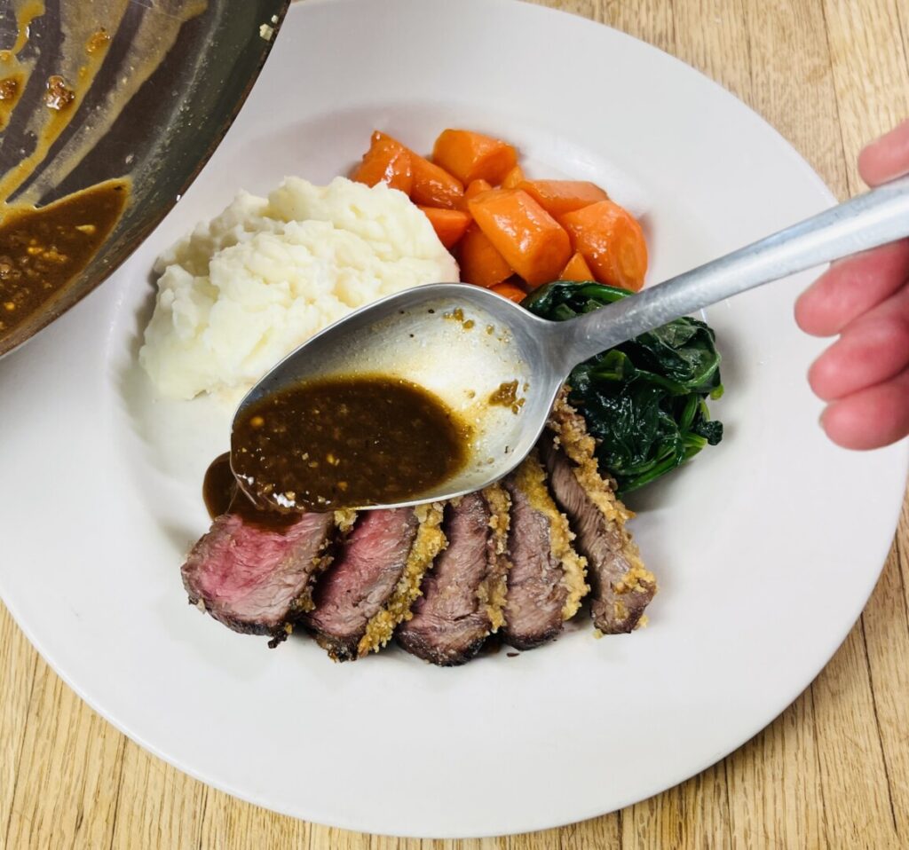 - Spoon the jus over the beef slices.