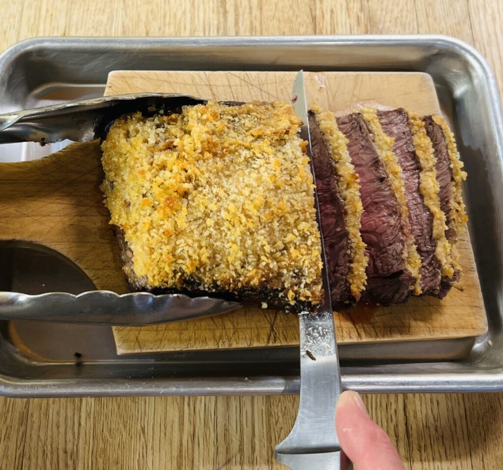 Now you’re ready to carve your steak. It’s extremely important to slice the steak across the grain so that it “eats” tender. Even though the cooked meat looks a little different than the raw cut, you should be able to remember the grain direction you identified earlier. Use a sharp knife and proceed carefully so as not to dislodge the topping.