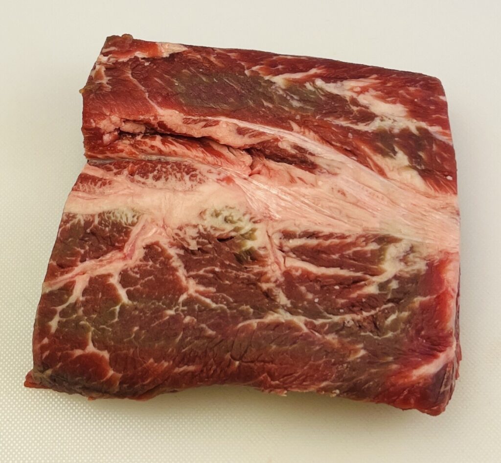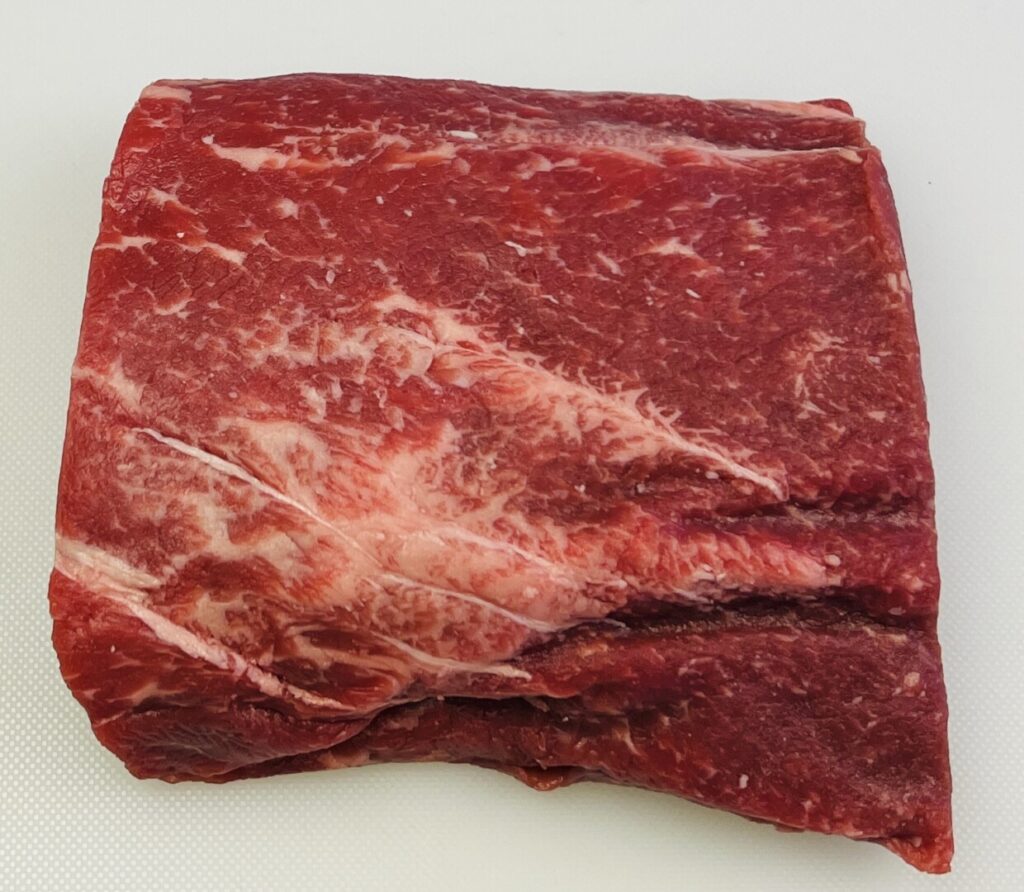 Chuck eye steak is cut from the top of the chuck. It’s an oval-shaped cut that’s slightly tougher than flat iron and that has several muscle bundles separated by fat and connective tissue.