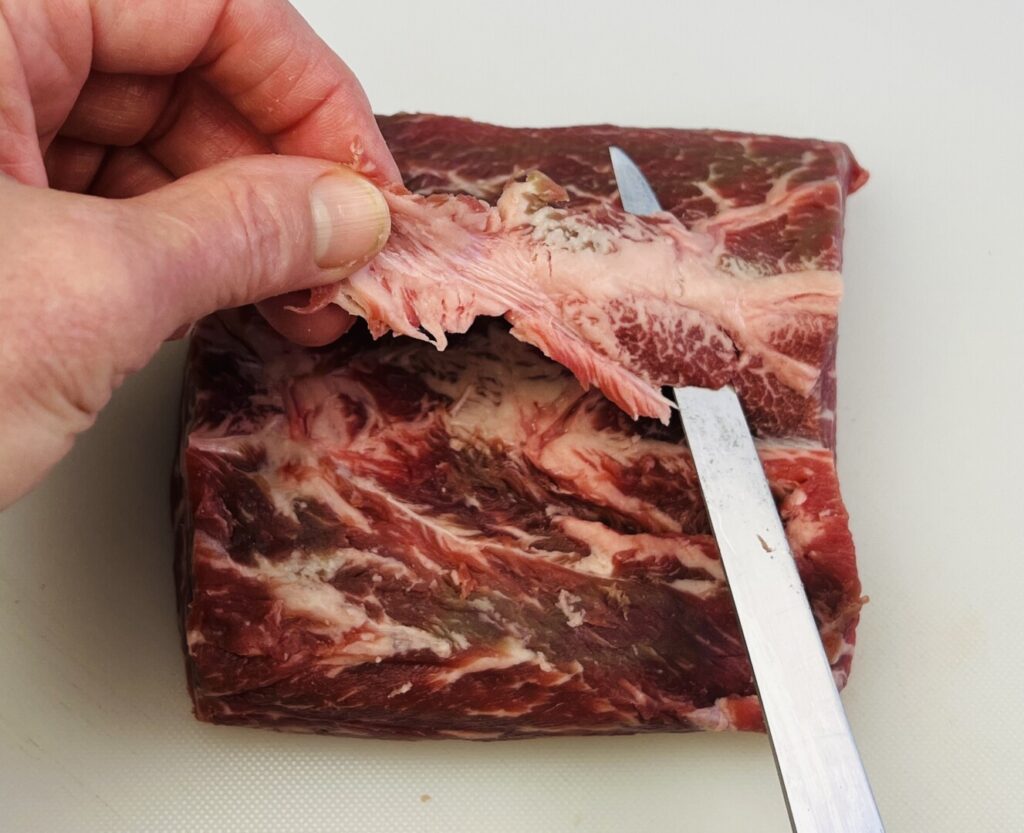 Once the beef is cut to the recommended portion size, remove any prominent connective tissue, then marinate.