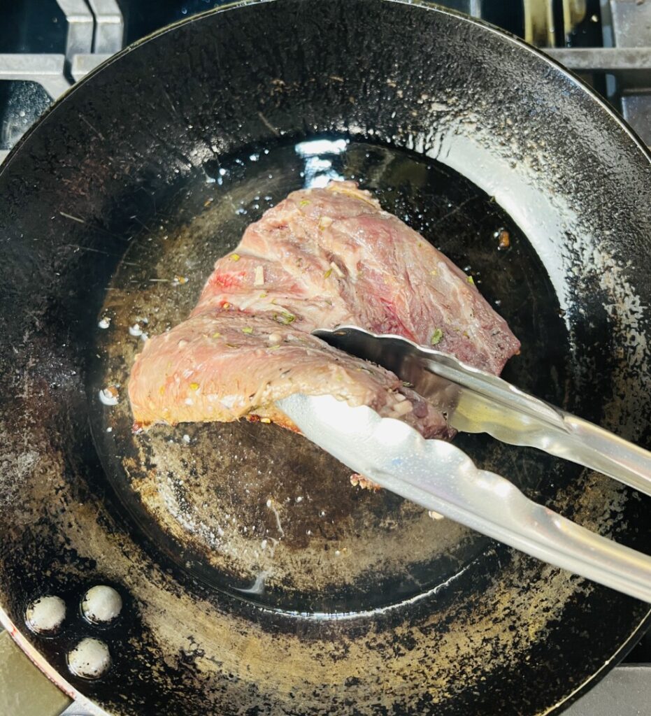 For safety as well as proper browning, be sure to blot the steak dry with paper towels after removing it from the marinade. Heat the pan very hot, until you see wisps of vapor rising from the surface, then add the oil. Add the meat and sear it for a minute or so on each side. The object here is to brown the exterior of the meat, not cook it through. Remove the steak to a rack set into a roasting pan.