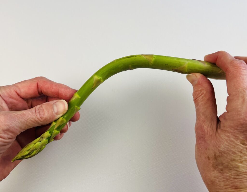 To fabricate the asparagus, first snap the spears to separate the tender part from the more fibrous butt ends. Grasp each spear with two hands, one at the tip and the other at the butt end. Gently bend the spear. It will break at the interface of tender and tough. Discard the butt ends.
